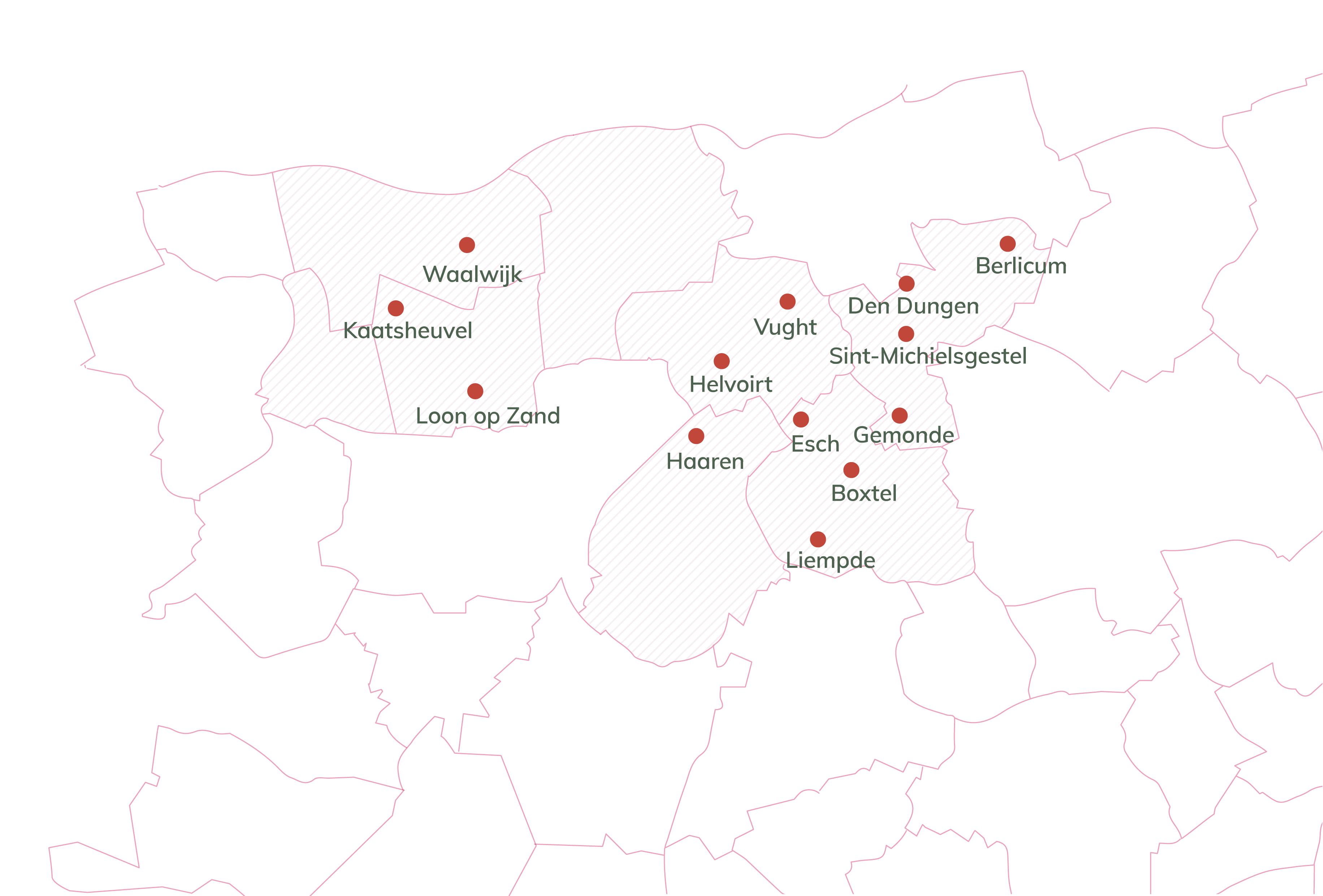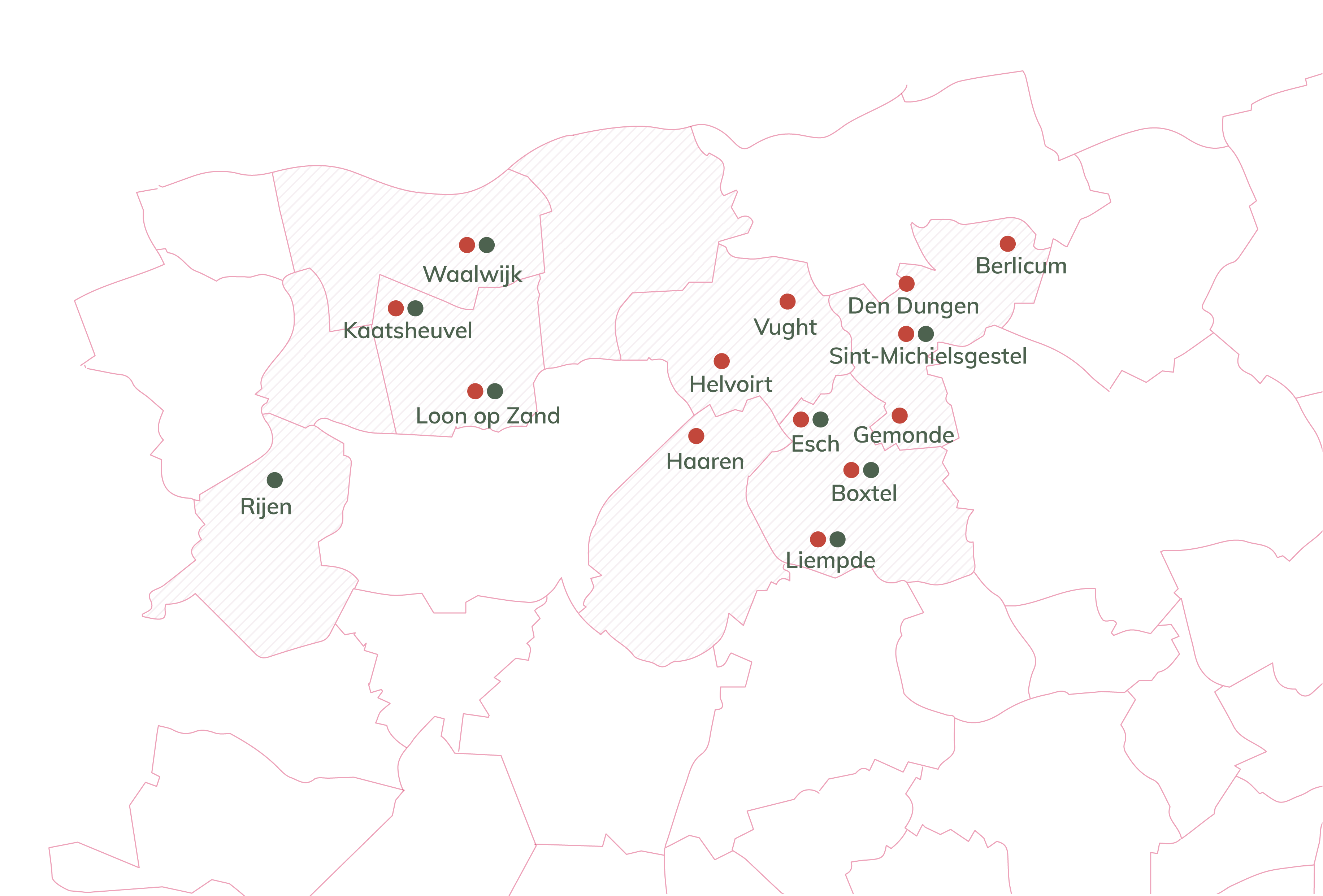 Wij zijn actief in 14 kernen in Midden- en Noordoost-Brabant. De meeste ouderen die wij verzorgen, wonen op een van onze 12 zorglocaties. Daarnaast leveren we zorg aan huis, ook door een psychogeriatrisch en verpleegtechnisch team.